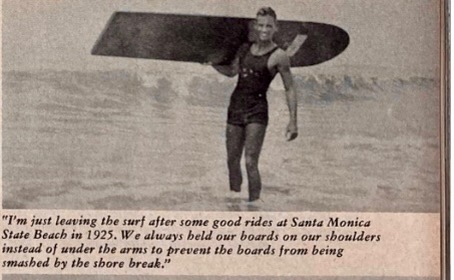 New Jersey-born Sam Reid was an American surfing pioneer, distinguishing himself as the first person — along with Tom Blake — to ride Malibu in Los Angeles County. Reid was 7 years old in 1912 when Duke Kahanamoku of Hawaii surfing fame gave a demonstration in Atlantic City near Reid’s childhood home. The following day, Reid began riding waves on his mother’s ironing board and he continued to surf in Atlantic City until the family moved to Washington D.C. when he was 15 and a year later to Santa Monica.