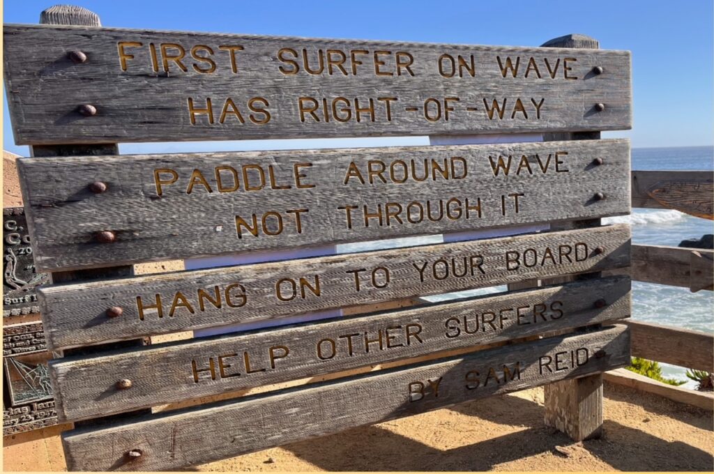 Despite his often-pessimistic view of modern wave-riding, Sam Reid remained a fixture in the surf community of Santa Cruz. In previous decades—but well after foam boards had taken over the sport—Reid could be found paddling his heavy redwood plank into the lineup at Steamer Lane wearing wool bathing trunks and surfing in the style he was taught by his Hawaiian friends in the 1920s. In later years, when Reid could no longer surf, he still drove to the bluffs at the Lane every day in his 1938 Packard and was happy to share stories of the past with Duke and Tom Blake. He was also ready, at all times, to call out surfers who were not following the rules. On the cliff at Steamer Lane is a wooden plaque stating those rules erected by the city of Santa Cruz, quoting Reid. “First surfer up has the right of way. Paddle around the wave not through it. Hang on to your board. Help out other surfers.”